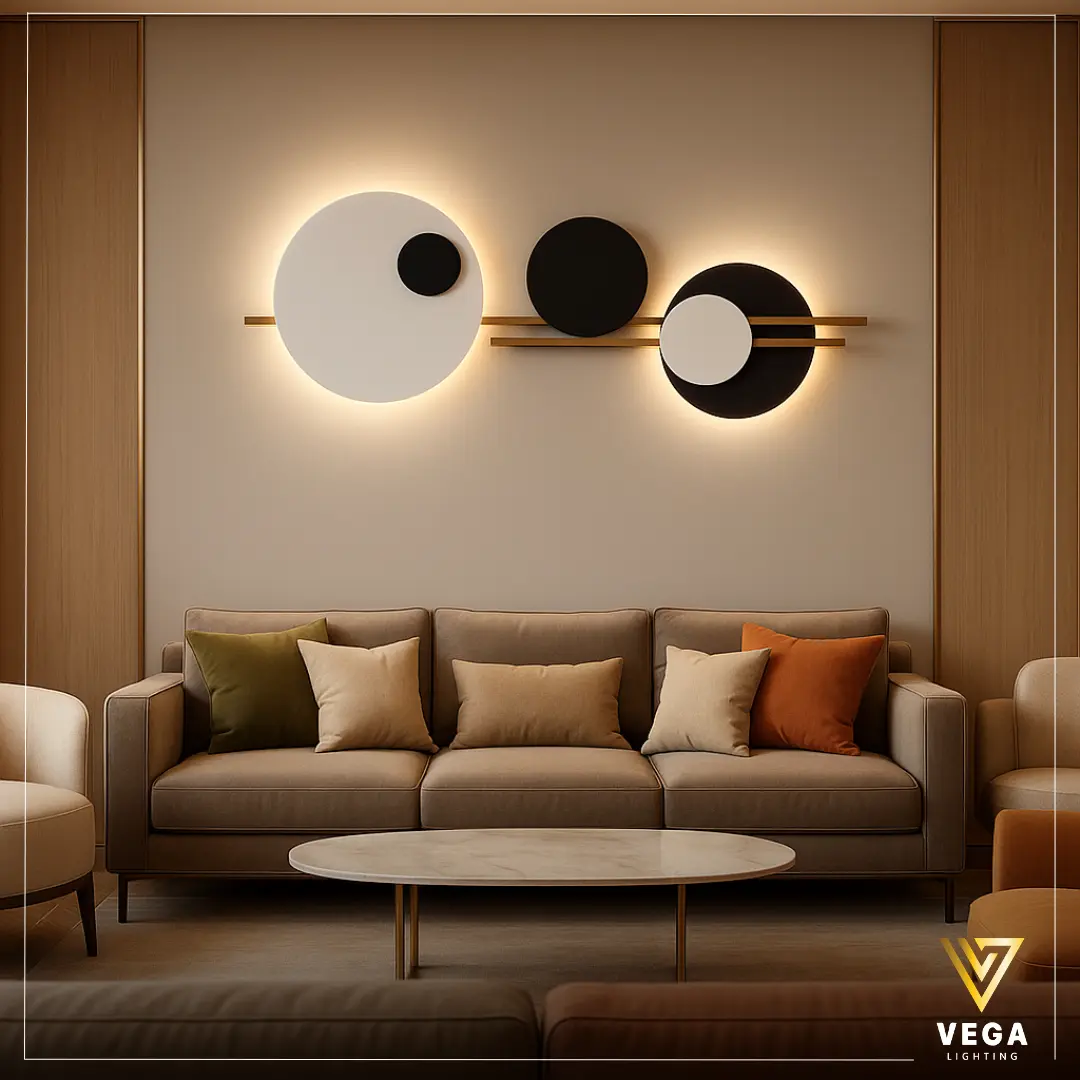 تأتي الإضاءة LED موزعة حول الدائرة الرئيسية، فتخلق هالة خفيفة تظهر التصميم بشكل أعمق. هذا النوع من الإضاءة يجعل أبليك لورين مناسبًا للأماكن التي تحتاج ضوءًا هادئًا مع قيمة تصميمية عالية في الوقت نفسه.