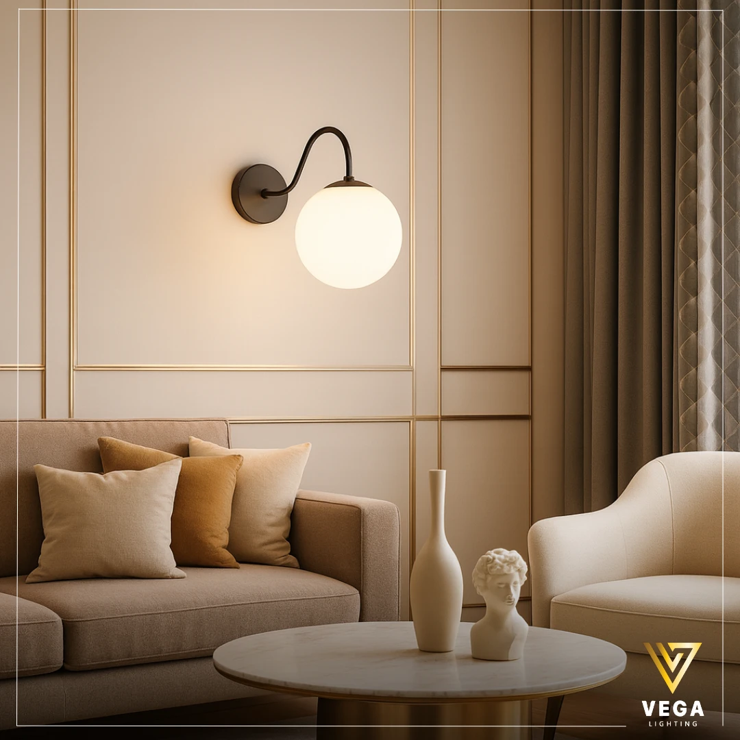 أبليك كروي أسود MOON مون هو وحدة إضاءة جدارية عصرية تجمع بين البساطة والأناقة، ويعتمد على تصميم كروي ناعم مع ذراع منحني يمنح الجدار توازنًا بصريًا ولمسة هادئة تناسب المساحات الحديثة. لذلك يُعد هذا الأبليك خيارًا عمليًا لمن يبحث عن إضاءة جانبية مريحة دون مبالغة في التفاصيل.