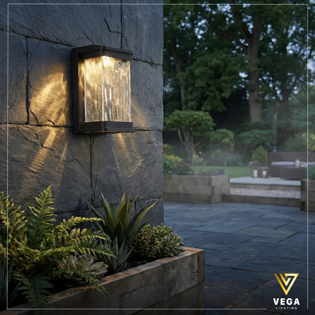 الزجاج الشفاف يسمح بظهور التأثير الضوئي بشكل طبيعي، لذلك يظهر الجدار بخامة أكثر وضوحًا وأناقة. كما أن الإطار الأسود أو الرمادي ينسجم بسهولة مع الحجر الطبيعي والخرسانة والخشب، مما يجعله مناسبًا للمداخل والجلسات الخارجية.