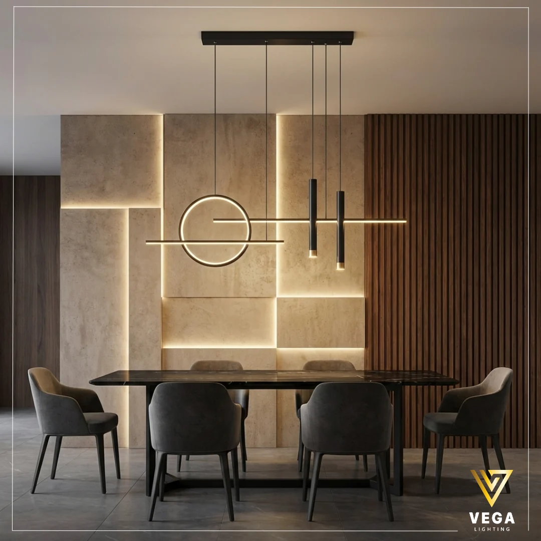 تعتبر نجفة فيوجن مودرن الخيار الأمثل لكل من يبحث عن الأناقة والتميز في ديكور منزله العصري. يجمع تصميم هذه القطعة بين الخطوط الطولية والدائرة المضيئة، مما يجعلها قطعة فنية فريدة تتناسب مع غرف الطعام. بالإضافة إلى ذلك، تمنحك هذه الثريا توزيعاً ضوئياً مريحاً يخلق جواً من الفخامة. بناءً على ذلك، تعكس هذه الإضاءة المعلقة ذوقك الرفيع في اختيار أحدث صيحات الديكور العالمية لعام 2026.