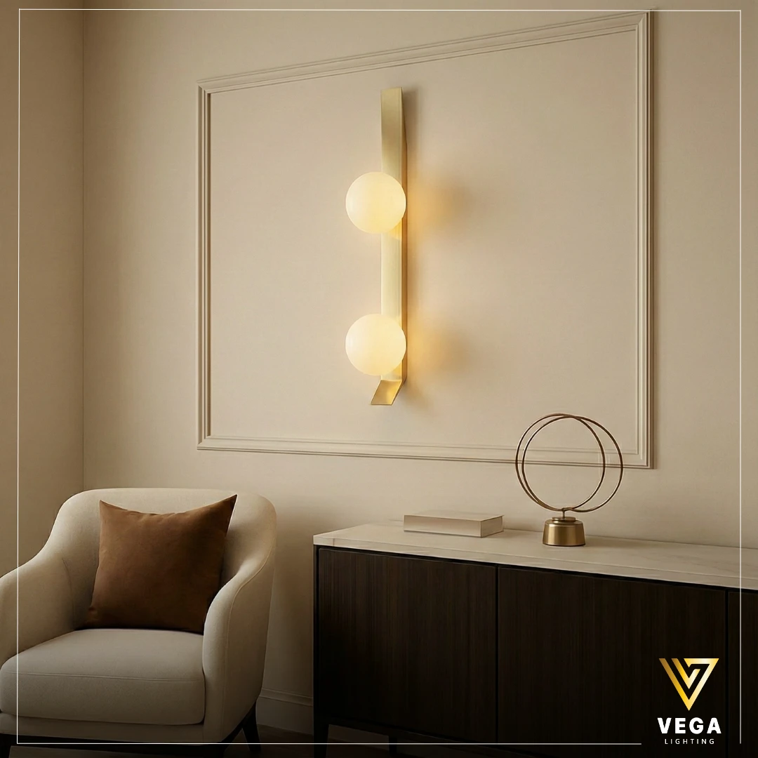 صورة توضح أبليك VERTI بتصميم طولي ذهبي ولمبتين، مناسب لغرف النوم والممرات بإضاءة دافئة متوازنة.