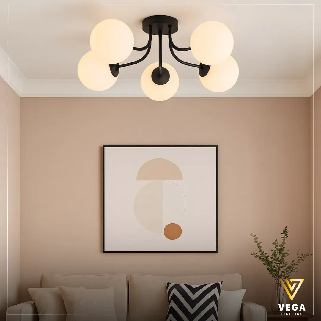 نجفة سيليو مودرن تعد واحدة من أفضل الخيارات للمساحات العصرية التي تحتاج إلى إضاءة دافئة مع تصميم راقٍ وبسيط. تعتمد النجفة على هيكل معدني أسود مطفي بخطوط انسيابية تحمل خمس كرات زجاجية دائرية، مما يمنح توزيعًا متساويًا للضوء ويضيف لمسة ديكور جذابة للمكان. منذ النظرة الأولى، يظهر الطابع العصري للنجفة، وهو ما يجعل نجفة سيليو مودرن اختيارًا مثاليًا للمنازل الحديثة.