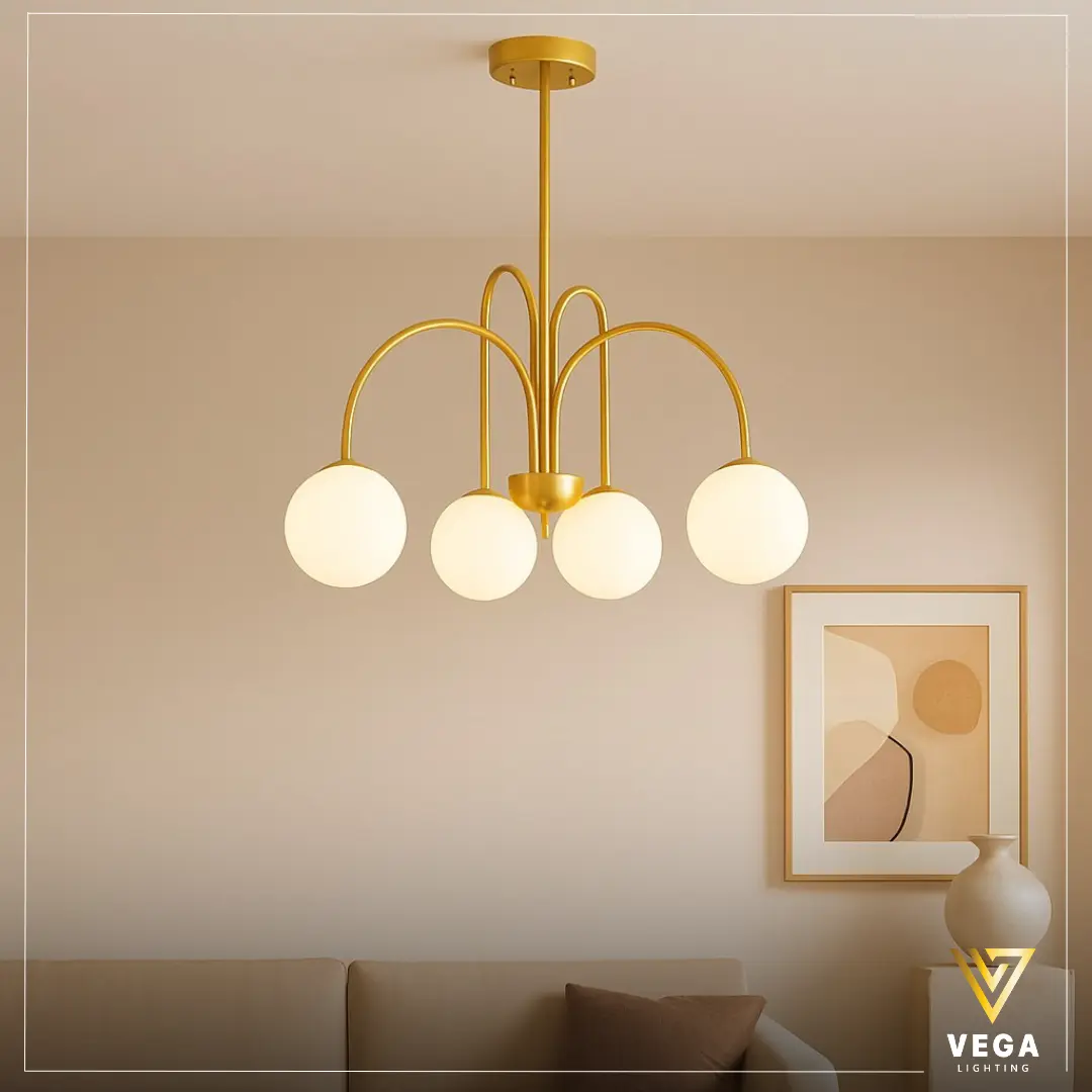 تتميز هذه النجفة المودرن بتصميم منحنى يضيف حركة جمالية داخل الغرفة. اللون الذهبي المطفي مع الزجاج الأبيض يمنح توازنًا بصريًا واضحًا يجعل القطعة مناسبة لدمجها في الديكور الحديث دون أن تطغى على بقية العناصر. يمكن استخدام نجفة مودرن ذهبية منحنيّة في المساحات التي تحتاج لمظهر فخم وسهل الدمج في نفس الوقت.
